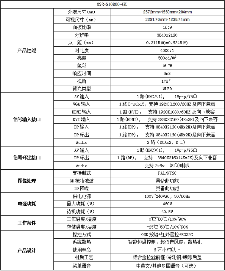 XSR-S10800-4K是新視銳一款108寸4K超高清液晶監(jiān)視器,分辨率為3840px ×2160px;其采用國際知名品牌液晶面板(如:LG、三星、夏普等)、頂級元器件材料,支持7x24小時不間斷運行,壽命高達60000小時;其搭載世界先進的視頻圖象處理芯片;自動色彩引擎CMM-6,確保色彩還原達到極至;支持多種信號輸入、環(huán)出。