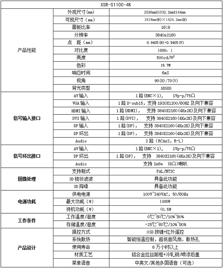 新視銳110寸4倍高清液晶顯示器性能參數(shù):