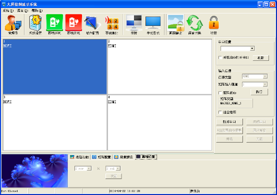 選擇多個拼接單元,2x2為例,選中4個屏后,在信源中選擇信號源,單擊“執行”按鈕完成拼接,點擊“圖像凍結”可以凍結當前畫面,再次點擊解除靜像。
